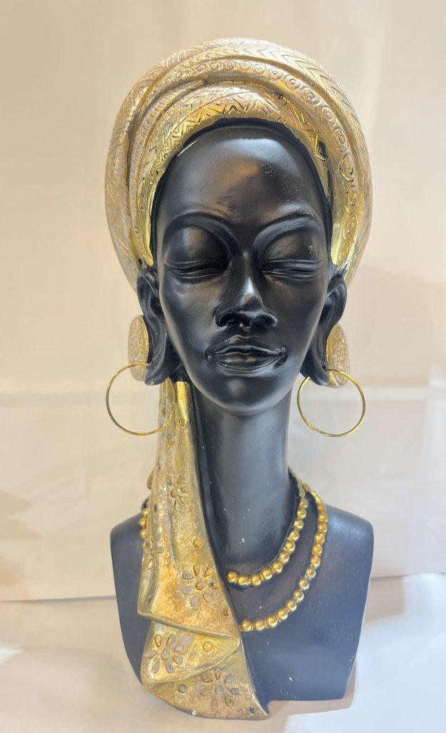 Esta escultura captura la belleza atemporal y la dignidad de la mujer africana. Moldeada en resina, la pieza presenta un acabado en negro mate que sirve como el lienzo perfecto para resaltar los lujosos detalles en dorado envejecido .