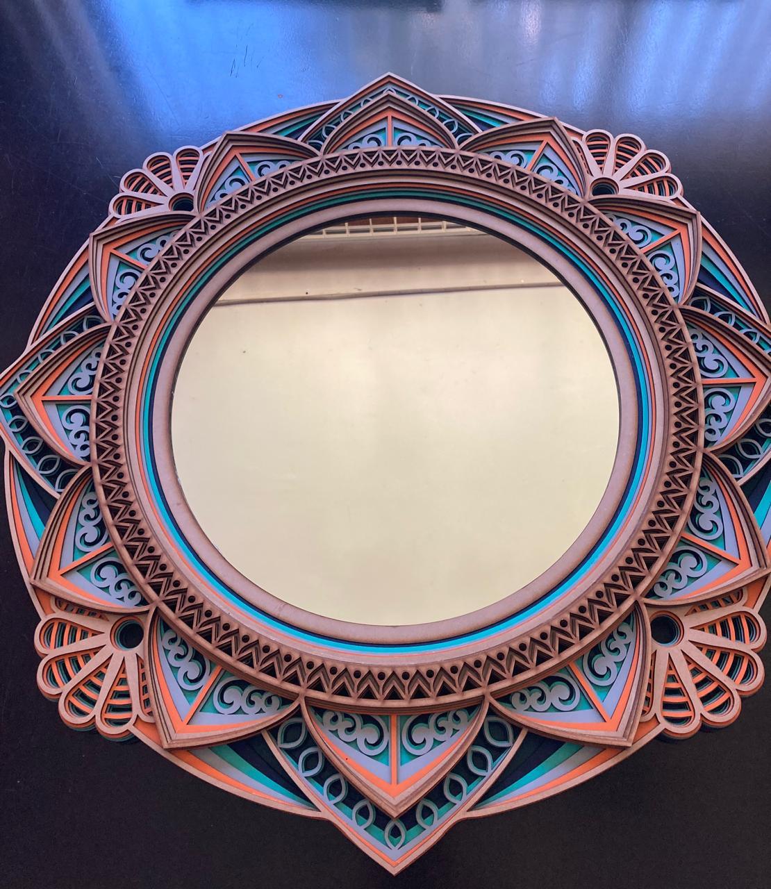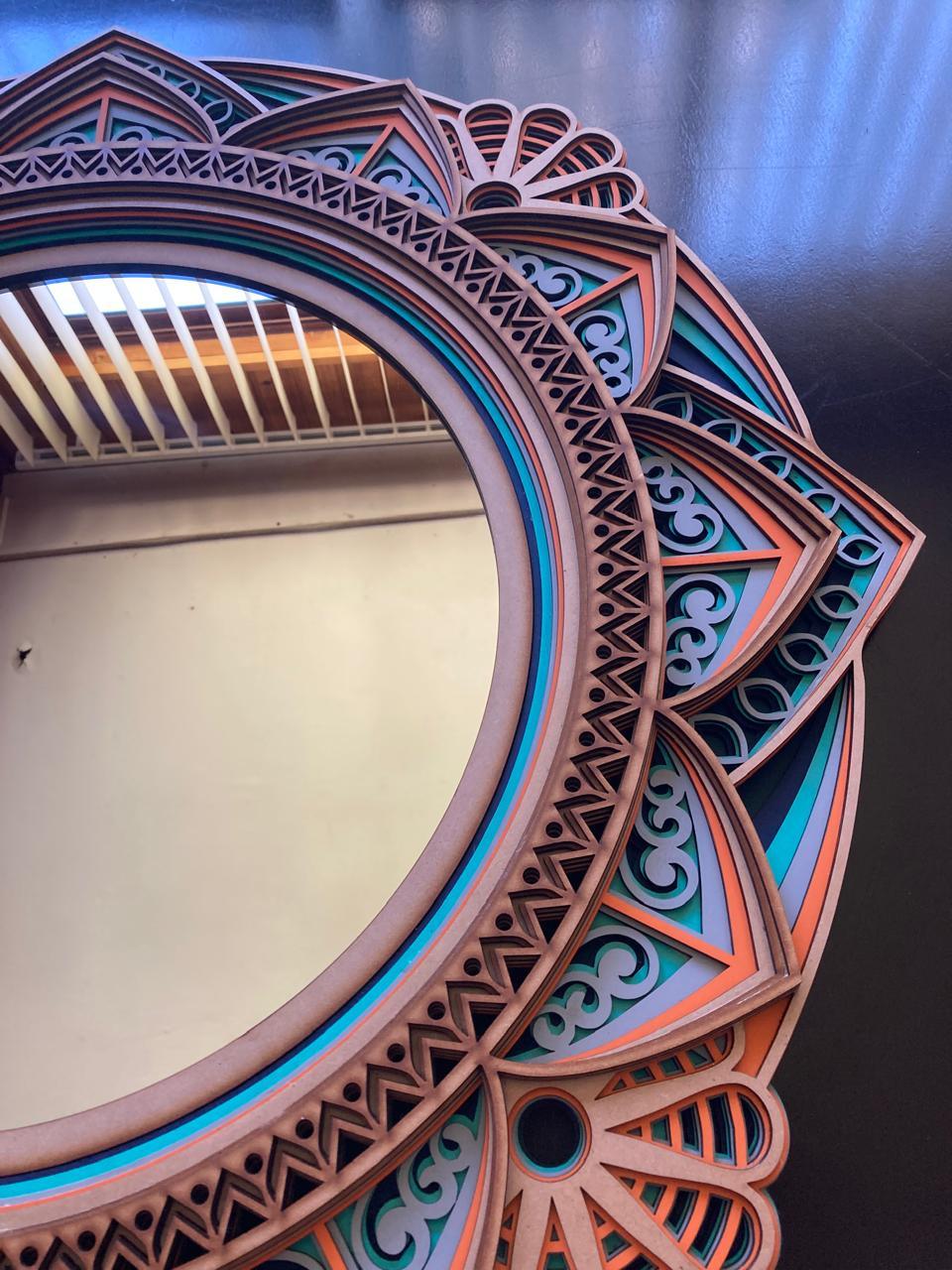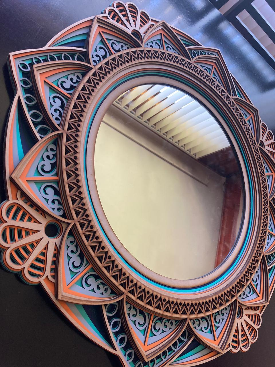 Si buscas que tus paredes hablen, el espejo modelo “Zenith” tiene mucho que decir. Inspirada en la geometría sagrada de los mandalas, esta pieza es una fusión perfecta entre tecnología y artesanía tradicional.
