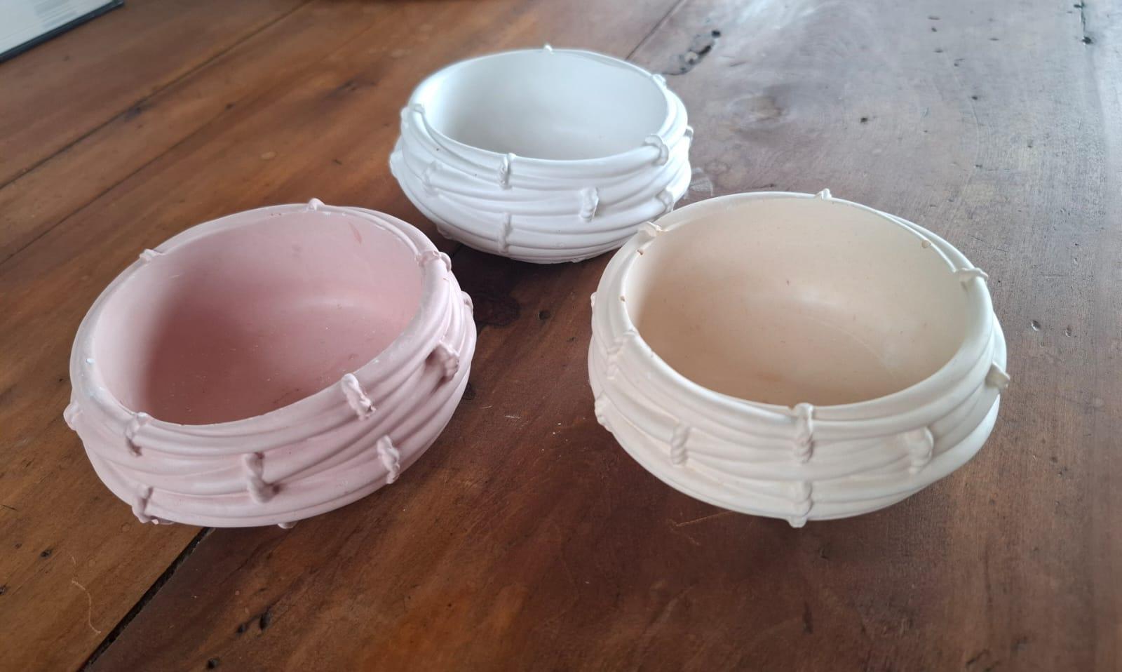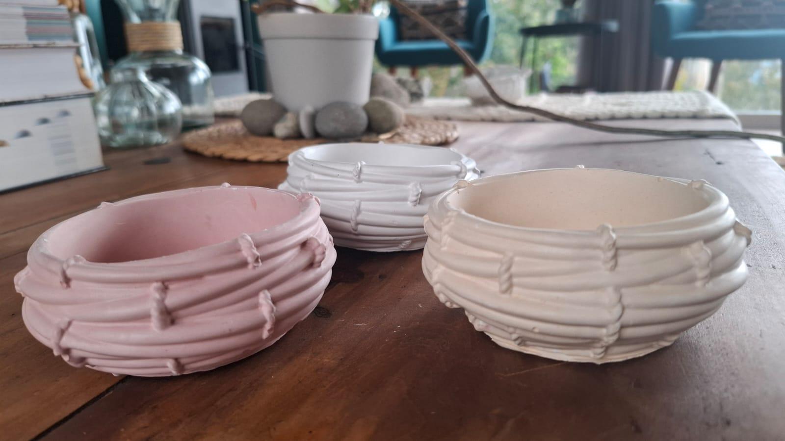 Son fabricados en yeso, lo que les otorga una textura suave y un acabado elegante. Con un estilo que recuerda a cestas tejidas, gracias a sus detalles en relieve que simulan las fibras entrelazadas. Disponibles en tres colores suaves: blanco, rosa claro  y  beige o blanco, celeste y beige.